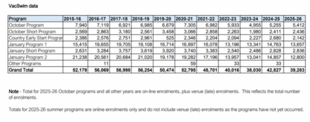 Figures released under Freedom of Information laws show total VacSwim enrolments have fallen from 56,998 in 2017-18 to just 39,283 in 2025-26 – an alarming 31 per cent drop since Labor took office.